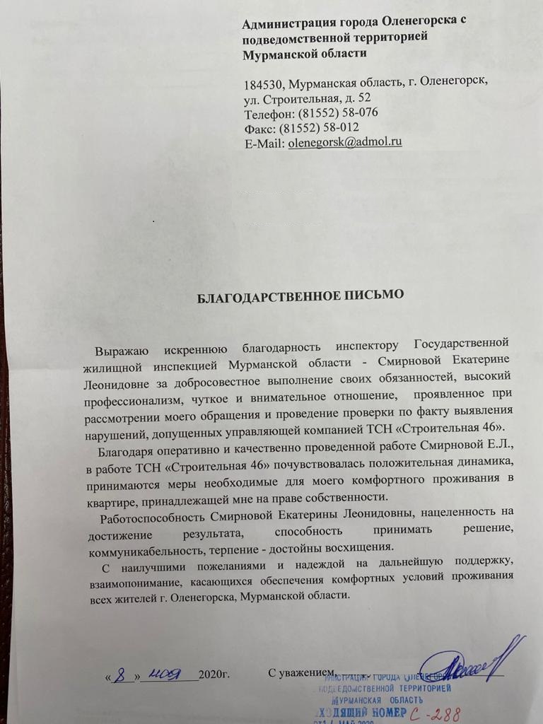 Благодарность главному специалисту Государственной жилищной инспекции Мурманской области Е.Л. Смирновой